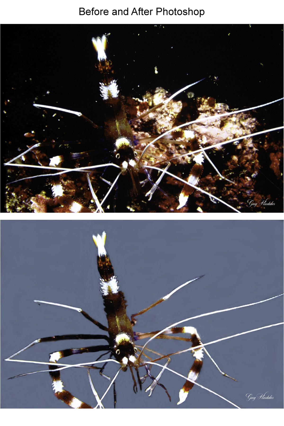 Barberpole Shrimp (before and after photoshop)- Gary Hardaker