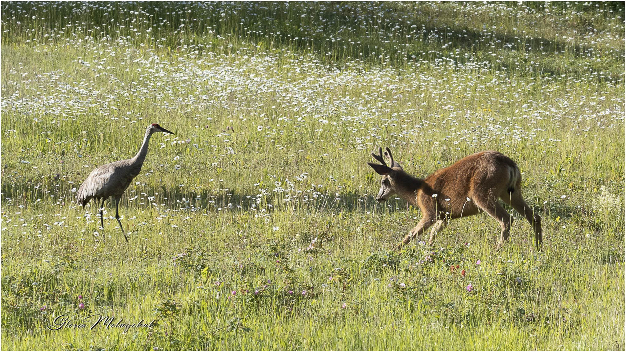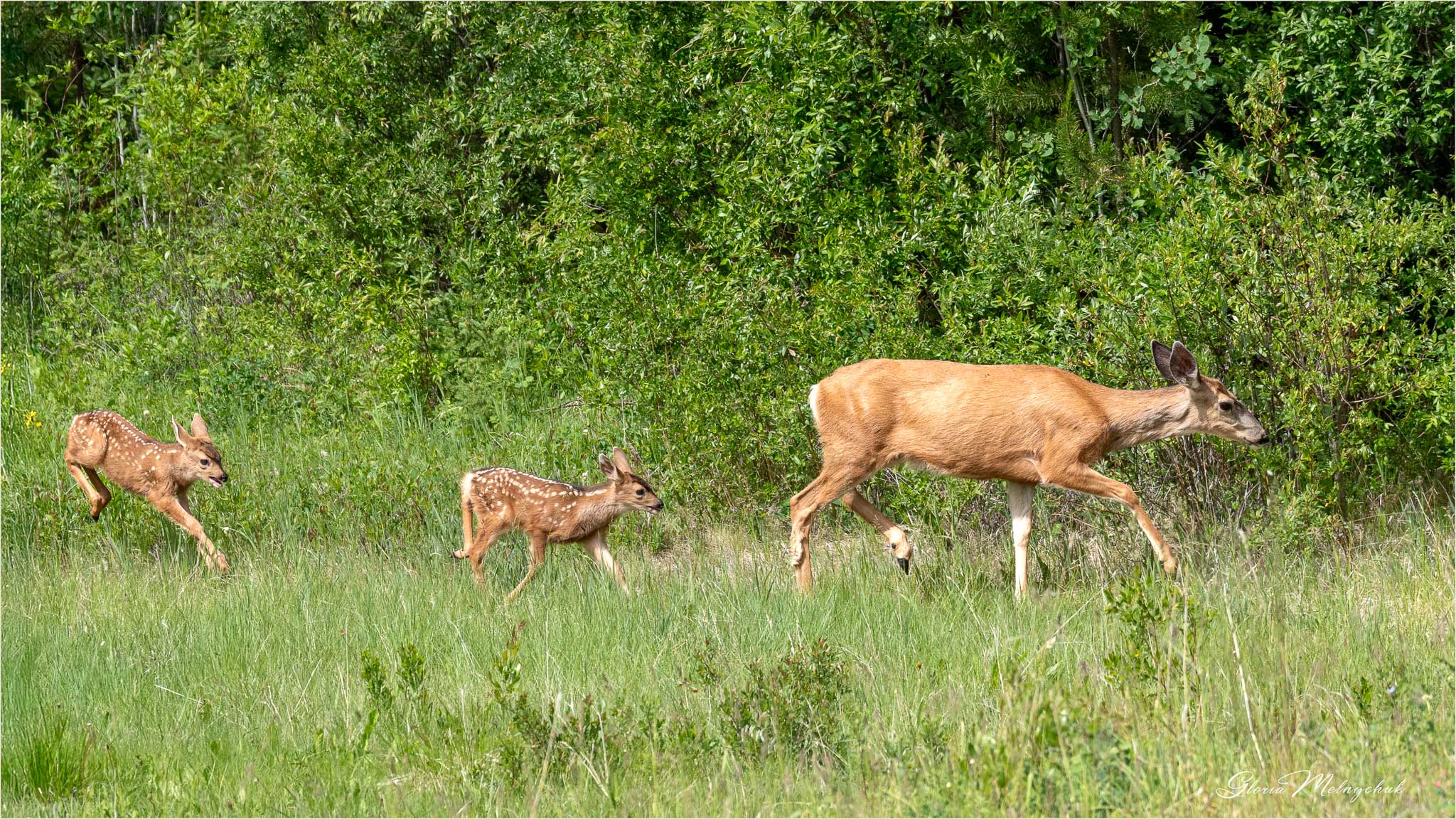Up, up and away – Gloria Melnychuk _WGP3461 – “Up, up and away, Into the woods I go to play” ~ Mule Deer buck bounding away after visiting with Ben at the barn