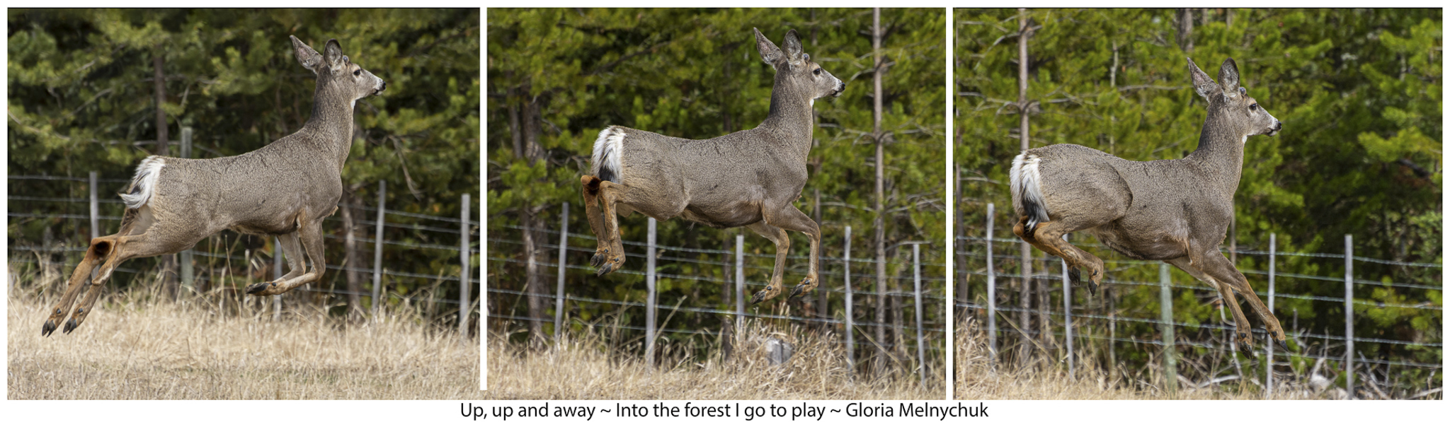 Up, up and away – Gloria Melnychuk _WGP3463 – “Up, up and away, Into the woods I go to play” ~ Mule Deer buck bounding away after visiting with Ben at the barn