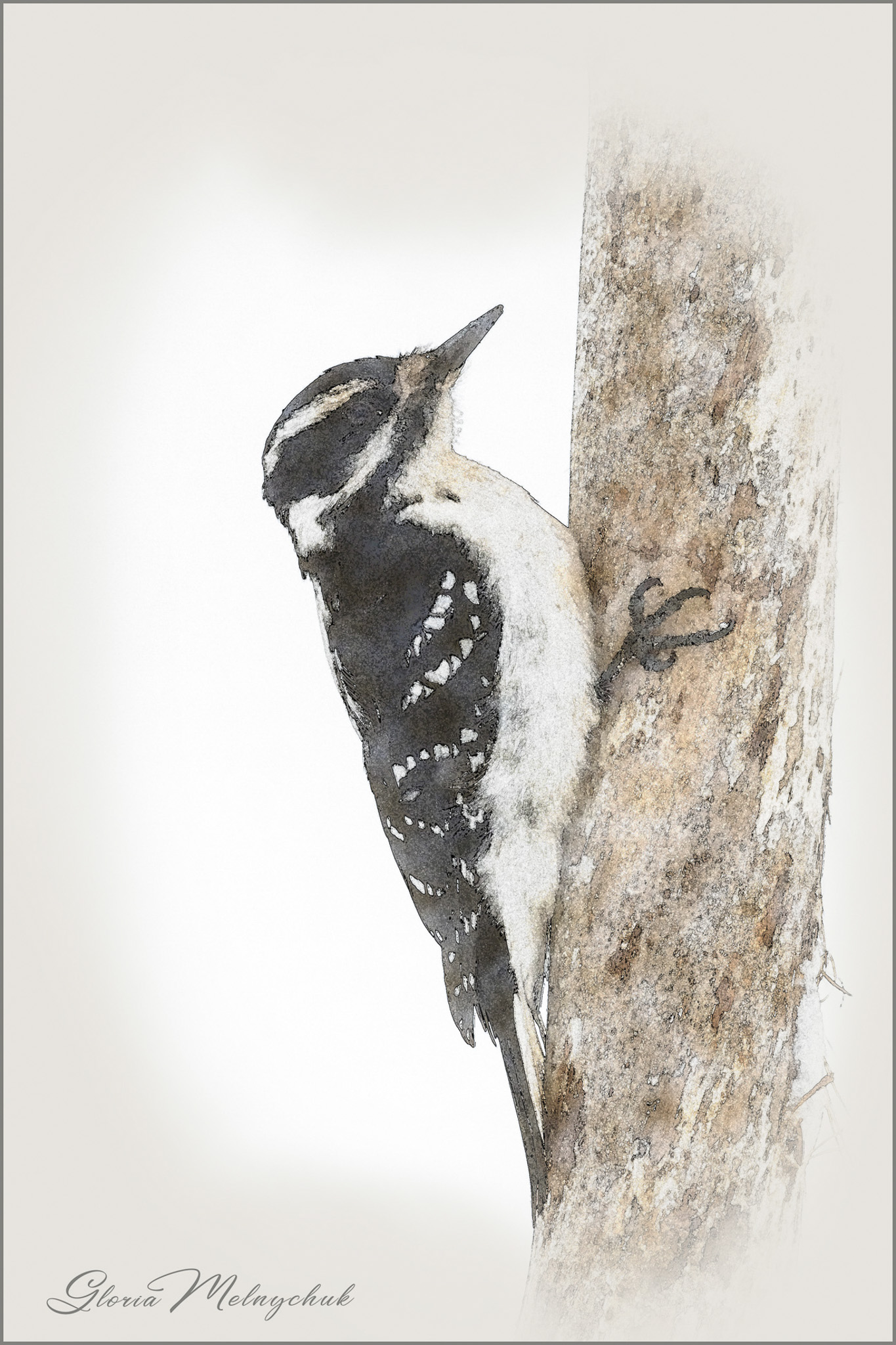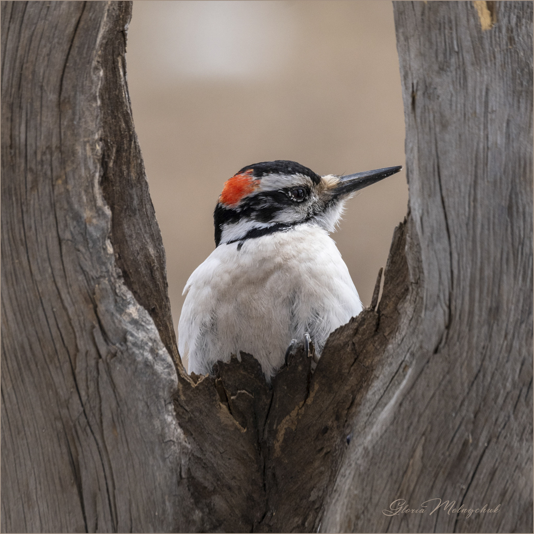 Male Juvenile Hairy Woodpecker – Gloria Melnychuk _GMP2350-02 – Notice that the red patch on the male juvenile Hairy Woodpecker is on his forehead.