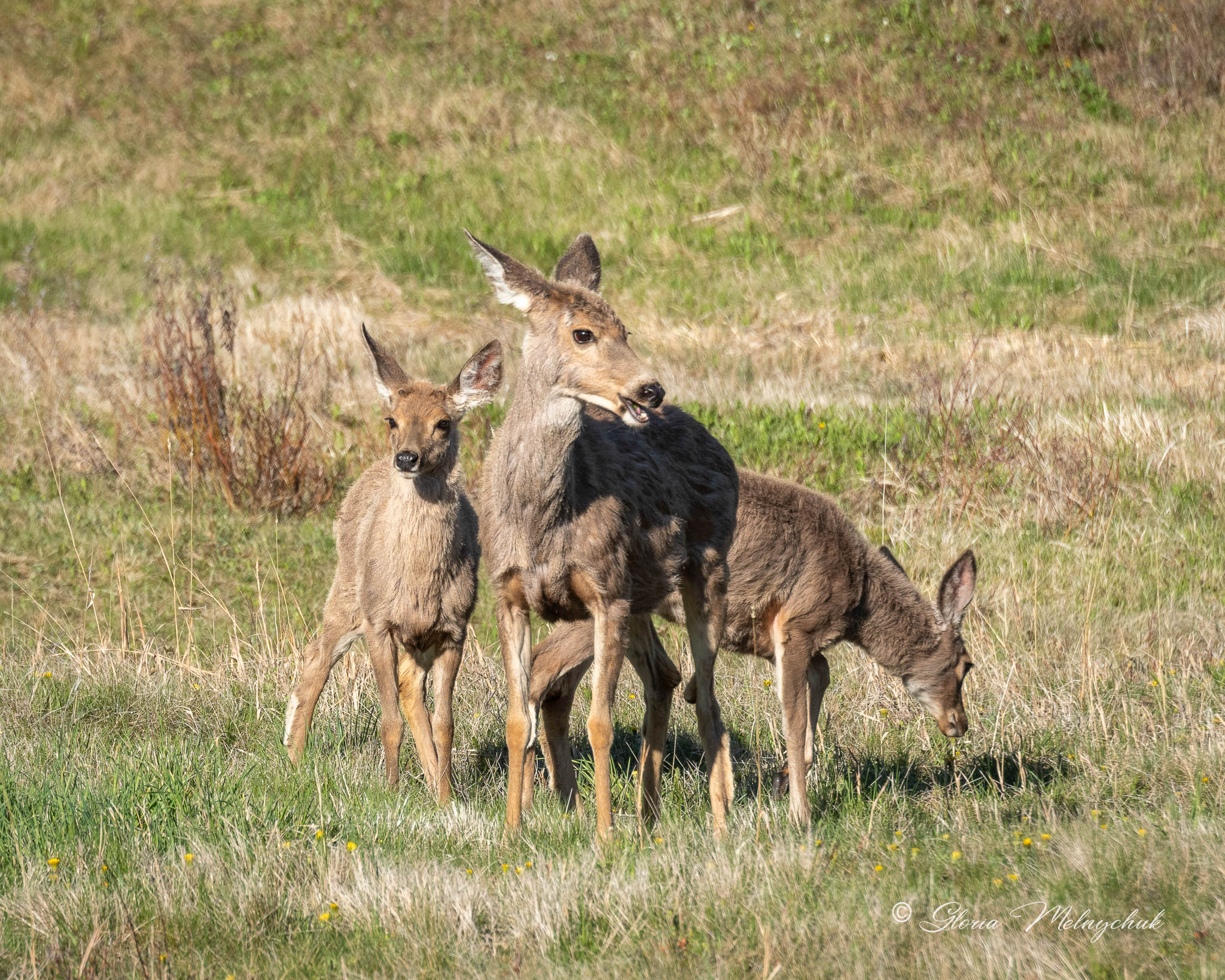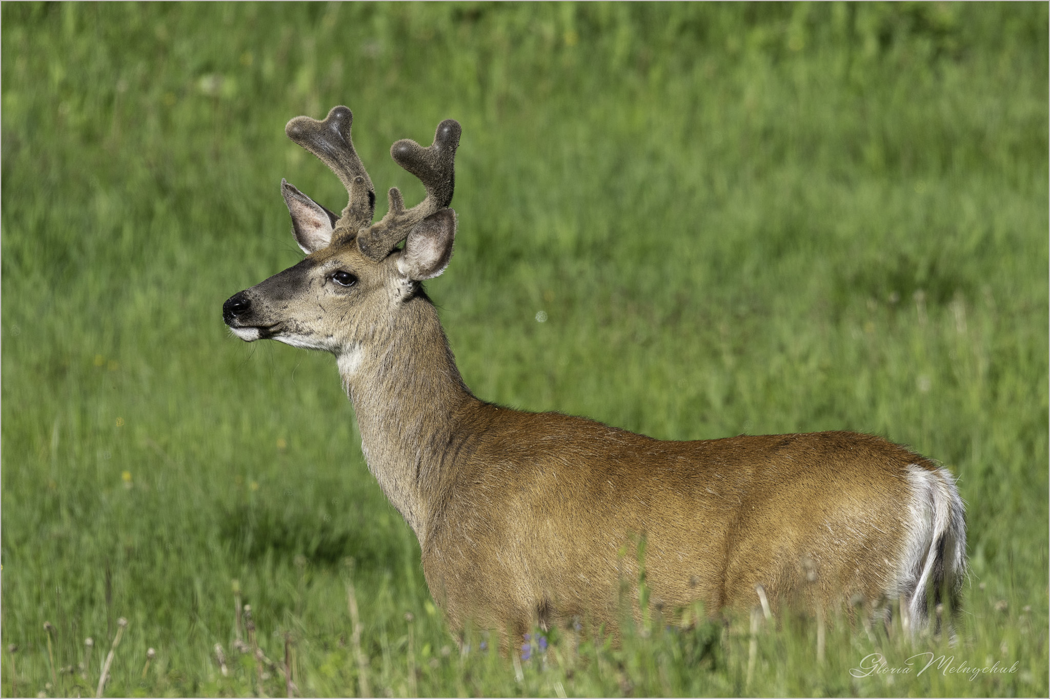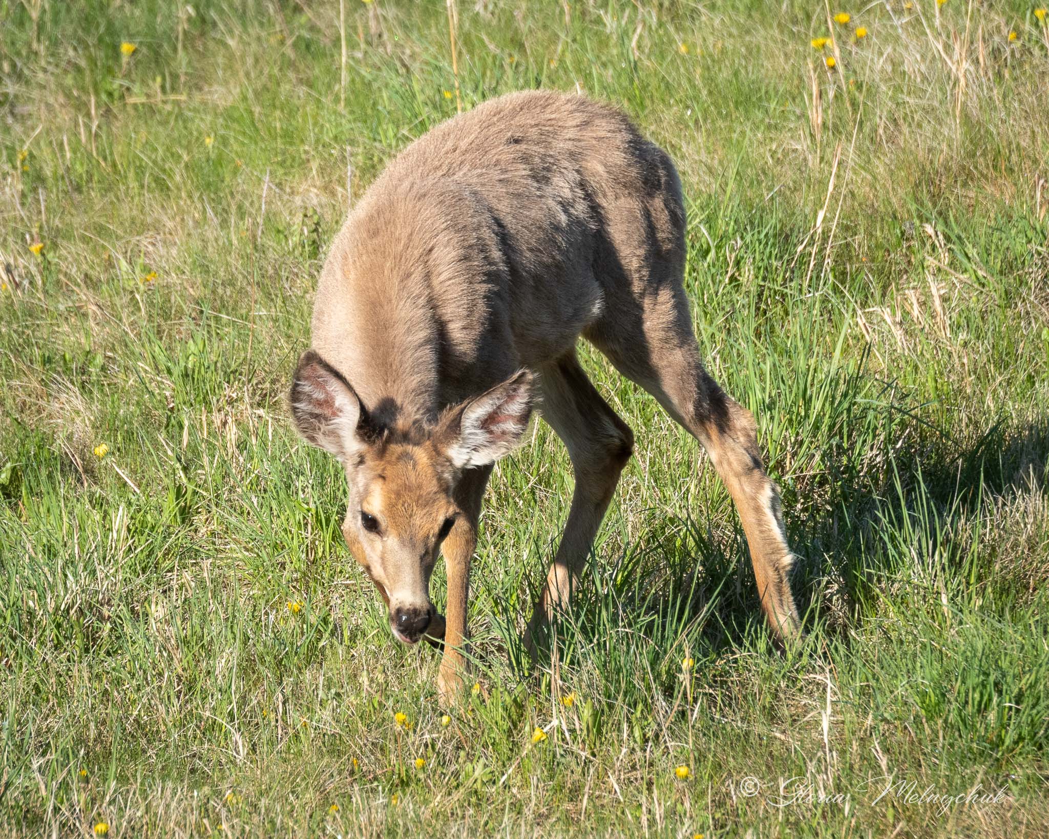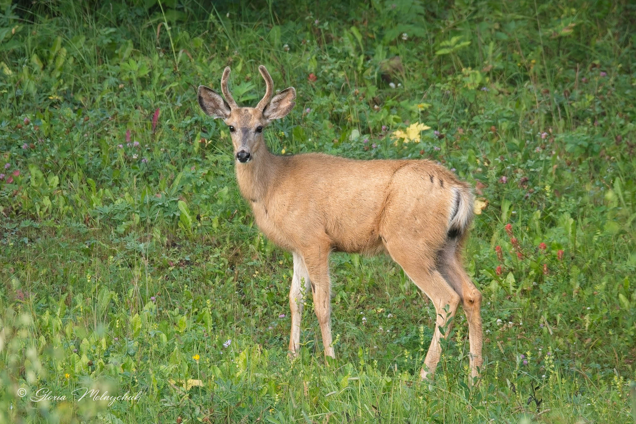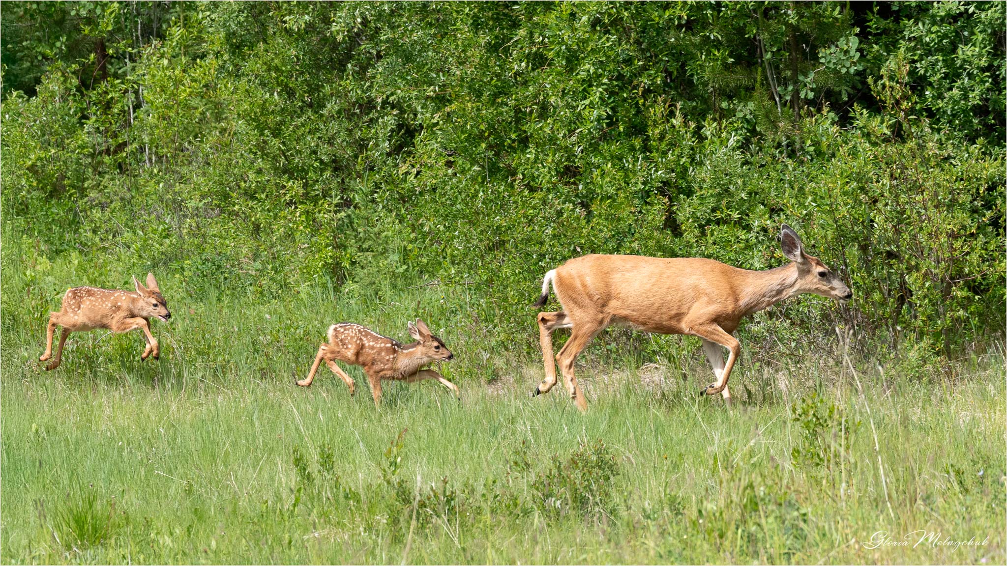 Up, up and away – Gloria Melnychuk _WGP3462 – “Up, up and away, Into the woods I go to play” ~ Mule Deer buck bounding away after visiting with Ben at the barn